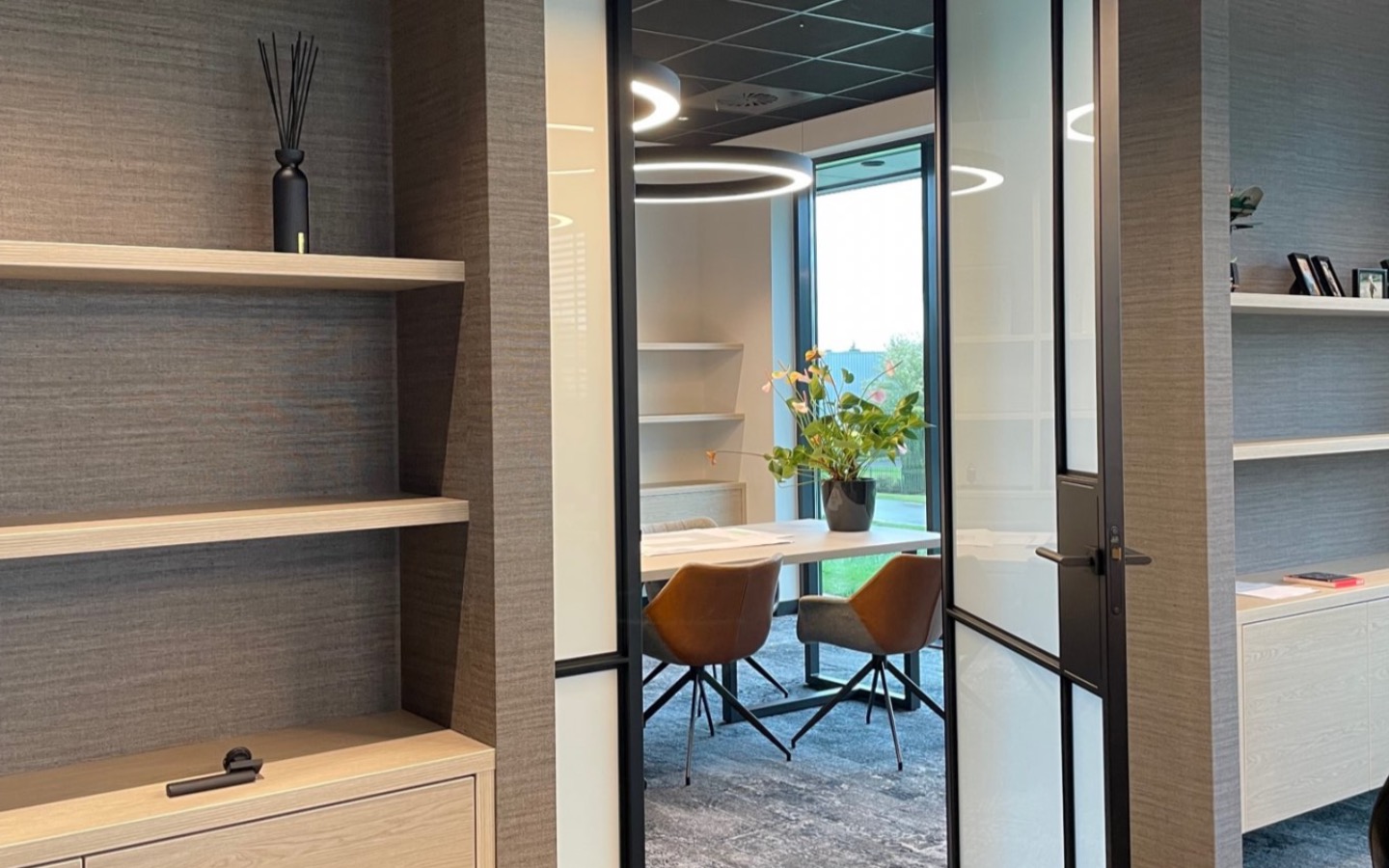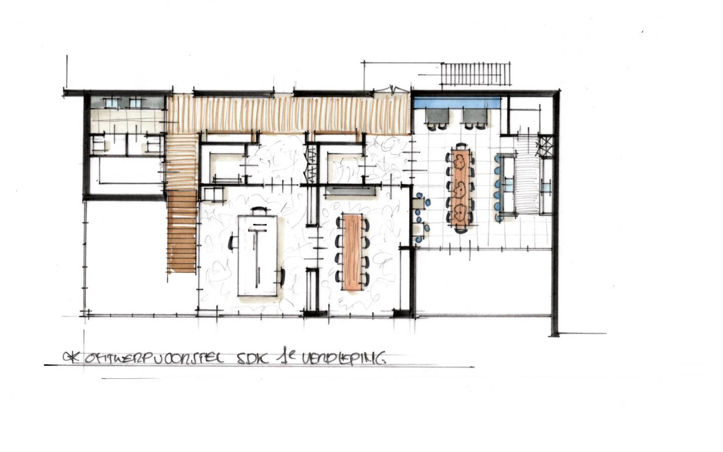 De mensen van SDK Koudetechniek hechten veel waarde aan de uitstraling van hun bedrijf en dus ook van het bedrijfspand. De entree mag gerust een belevenis zijn. Een ouderwets mooie binnenkomer. Modern, open en een logische plek om gasten welkom te heten. Ook was er de wens voor een plek om met een kleine club mensen te kunnen vergaderen. Een ruimte die verder gefaciliteerd is met alle noodzakelijke vergaderhulpmiddelen. Professioneel tot in de puntjes.