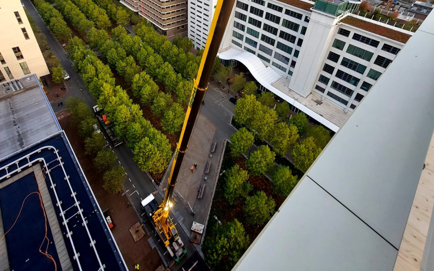 Je kan als ontwerper wel de mooiste ideeën bedenken, ze moeten wel realiseerbaar zijn. Zeker als een ontwerp zich op hoogte afspeelt, zoals in dit geval van het penthouse op Strijp in Eindhoven. Steegaa Interiors uit Helmond maakt het totaalinterieur naar ons ontwerp, Home Automation doet de gehele domotica met beeld en geluid, en Grillo natuursteen uit Huissen levert het natuursteen voor de badkamers en de keuken. Nu staat natuursteen niet bepaald bekend als zijnde licht. Dat til je dus niet zomaar even naar de 17e en 18e verdieping of de lift in. A. omdat het loeizwaar is en B. omdat je er niet aan moet denken dat het natuursteen beschadigd. Kortom, hijsen dus. Beter voor het natuursteen en onze rug. En het levert mooie plaatjes op :)