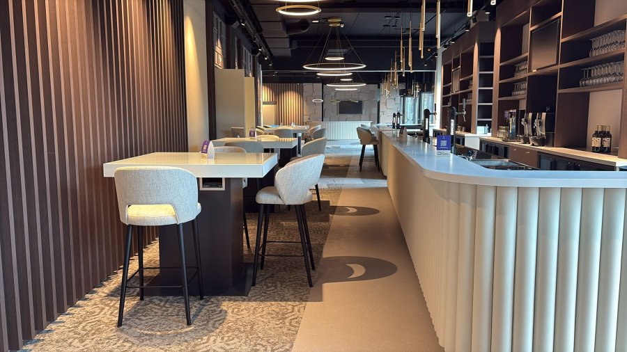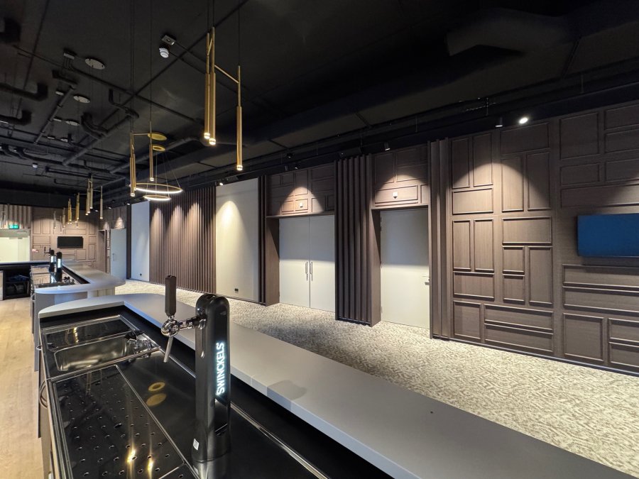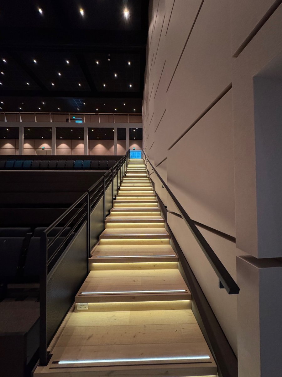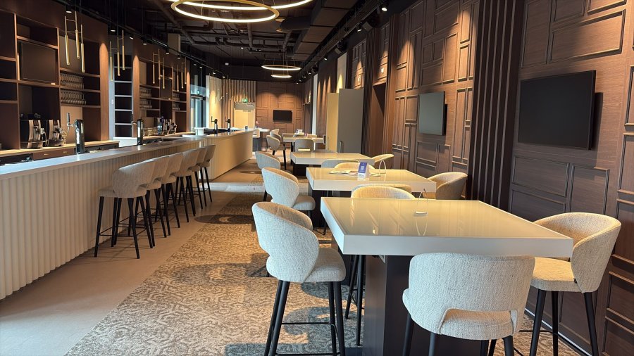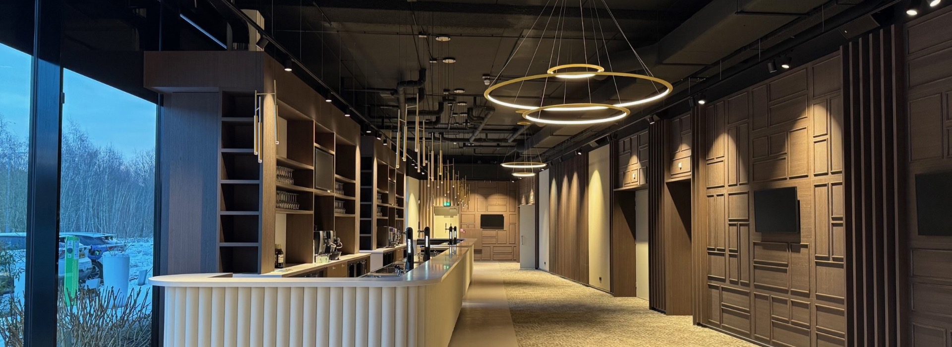 Het doel was helder: een omgeving die professioneel voelt, maar ook uitnodigt om te blijven hangen. Denk aan een auditorium met strakke zichtlijnen en sfeervolle trapverlichting, gecombineerd met een restaurantsetting met maatwerk bar, geïntegreerde verlichting en warme materialen.