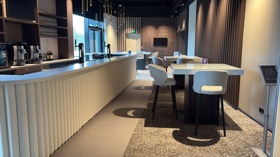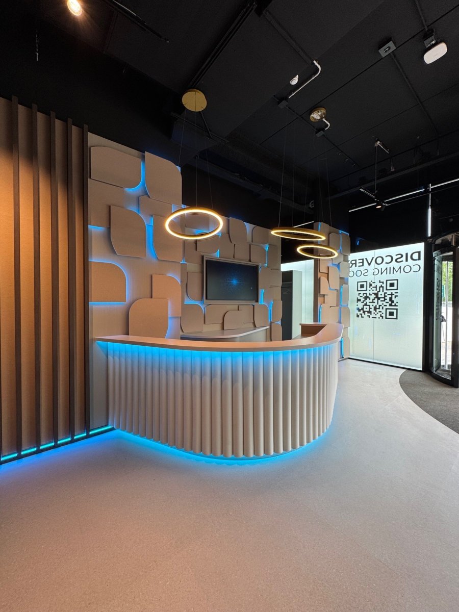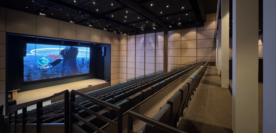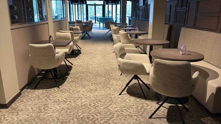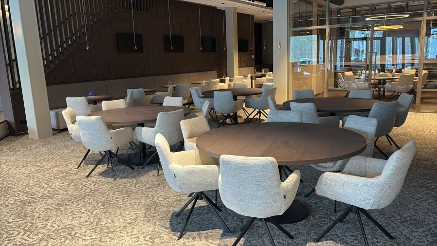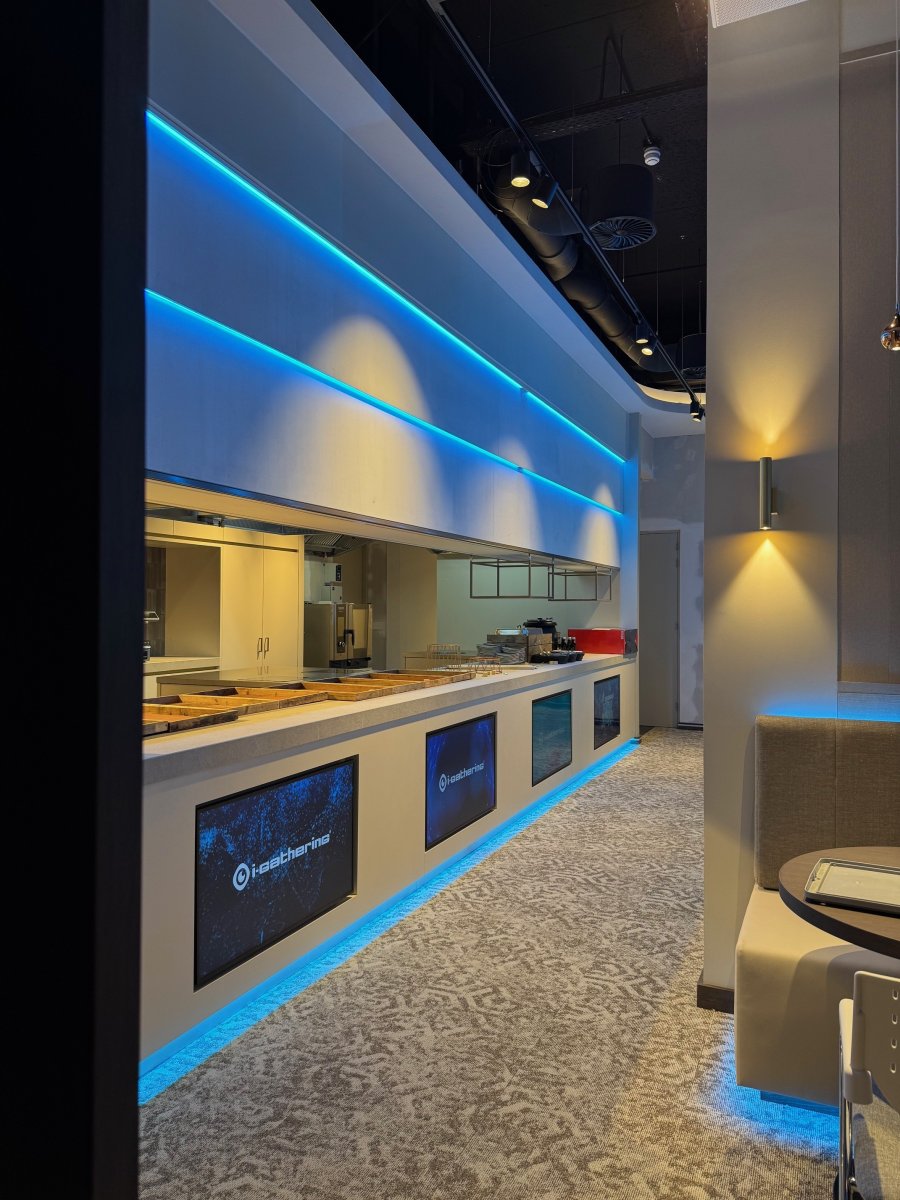Het doel was helder: een omgeving die professioneel voelt, maar ook uitnodigt om te blijven hangen. Denk aan een auditorium met strakke zichtlijnen en sfeervolle trapverlichting, gecombineerd met een restaurantsetting met maatwerk bar, geïntegreerde verlichting en warme materialen.